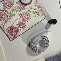 Place the script stamp face up and ink heavily with rich razzleberry, Take the fold in the left hand and lay the card front down on the inked script stamp, press evenly.